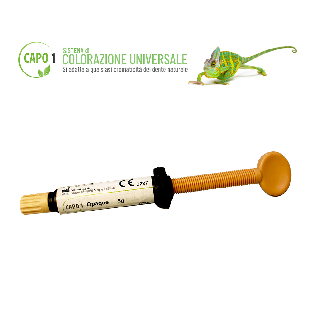 Composito microibrido opaco per schermare discromie del dente da restaurare prima di utilizzare Capo 1 Universale. EREF3 Micerium. CAPO1: SISTEMA di COLORAZIONE UNIVERSALE <b>Caratteristiche:</b> • Trasparenza molto elevata • Vero effetto camaleonte, restauri invisibili • Il composito si adatta al colore naturale del dente • Una sola massa consente di restaurare elementi dentali di qualsiasi cromaticità • Si adatta a qualsiasi cromaticità del dente naturale • Risultati estetici tempi ridotti alla poltrona Confezione: siringa da 5 gr.